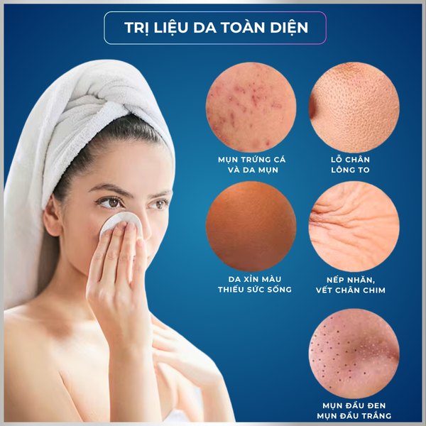 • Trẻ hóa da, chống lão hóa: Làm mờ nếp nhăn, vết chân chim, tăng độ đàn hồi và săn chắc cho da nhờ công nghệ RF và điện ion.