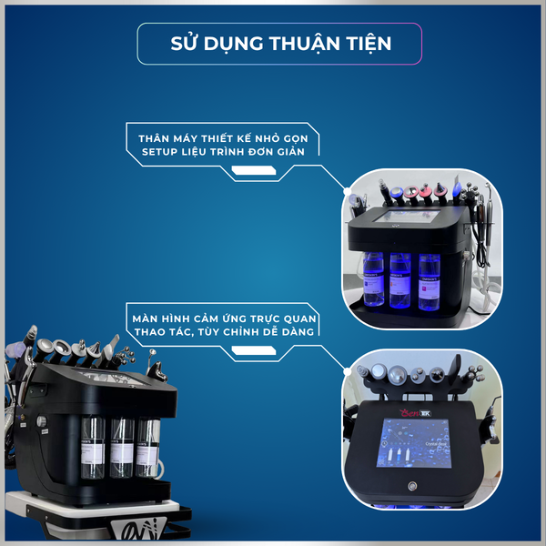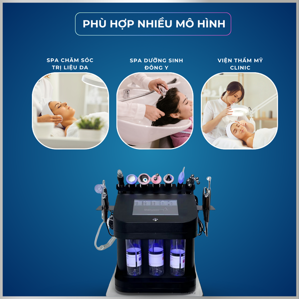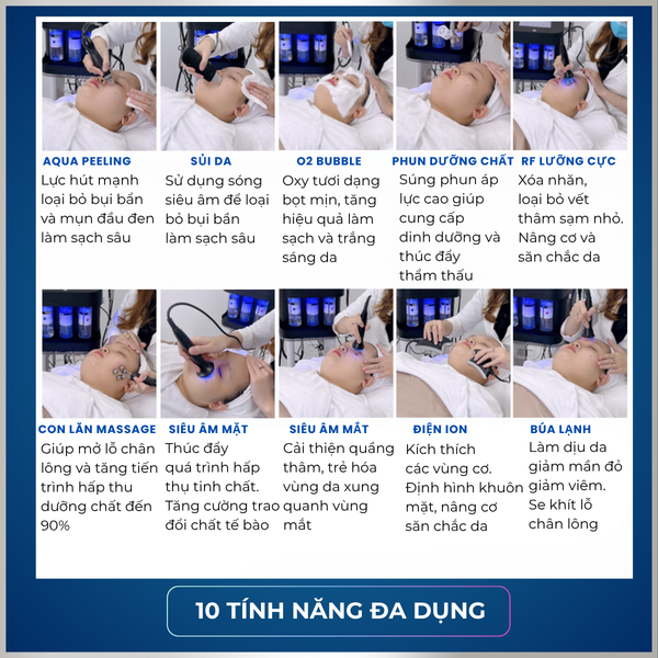 Thiết bị hoạt động trên 10 đầu dò chuyên sâu với công nghệ khác nhau, cho phép các kỹ thuật viên xây dựng phác đồ điều trị linh hoạt cho từng tình trạng da của khách hàng: